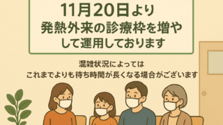 いつも当院をご利用いただきありがとうございます。年末年始の診療体制について、下記の通りご案内いたします。● 12月29日(月)総合診療・内科、発熱外来のみの診療 となります。● 12月30日(火)~ 1月4日(日) 休診 とさせていただきま...